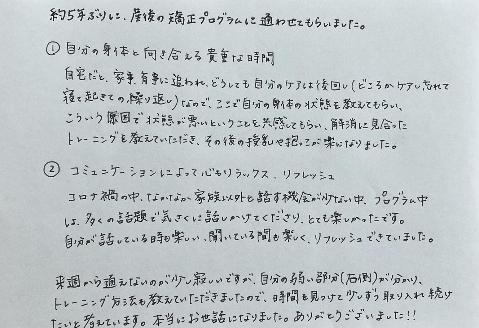 患者様の声(マタニティケア)、患者様の声(産後の骨盤矯正プログラム)