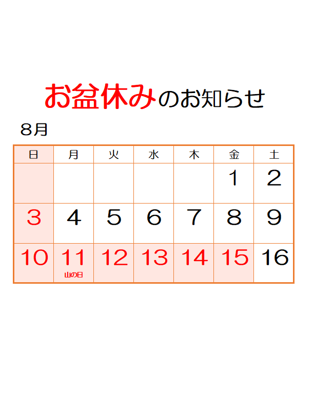 8月10日(日)~8月15日(金)までお休みさせていただきます。