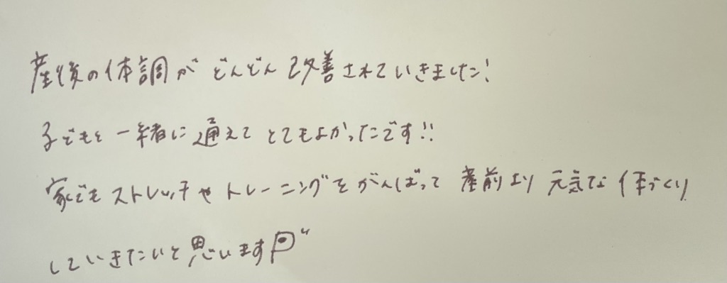 産後の体調がどんどん改善されていきました! 子どもと一緒に通えてとてもよかったです!! 家でもストレッチやトレーニングをがんばって 産前より元気な体づくりしていきたいと思います🎵