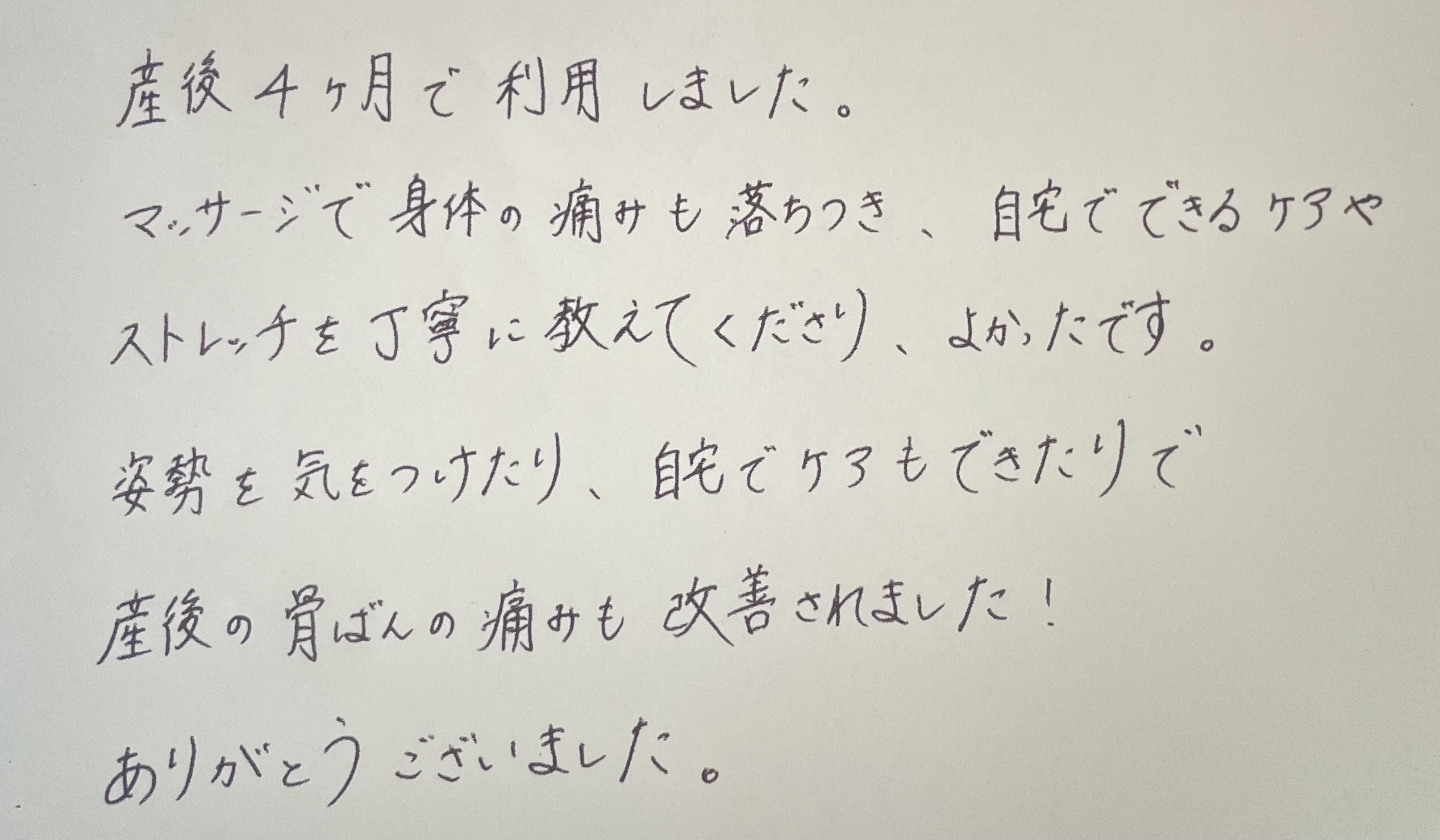 患者様の声(マタニティケア)、患者様の声(産後の骨盤矯正プログラム)