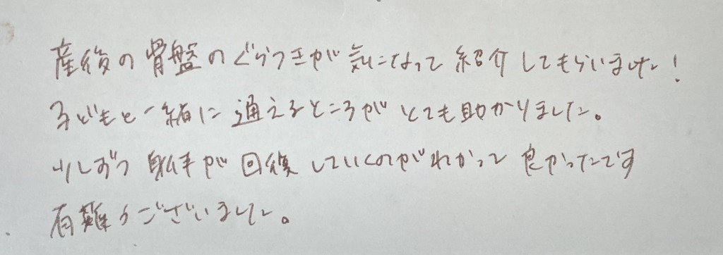 産後の骨盤のぐらつきが気になって 紹介してもらいました! 子どもと一緒に通えるところがとても助かりました。 少しずつ身体が回復していくのがわかって 良かったです。 有難うございました。