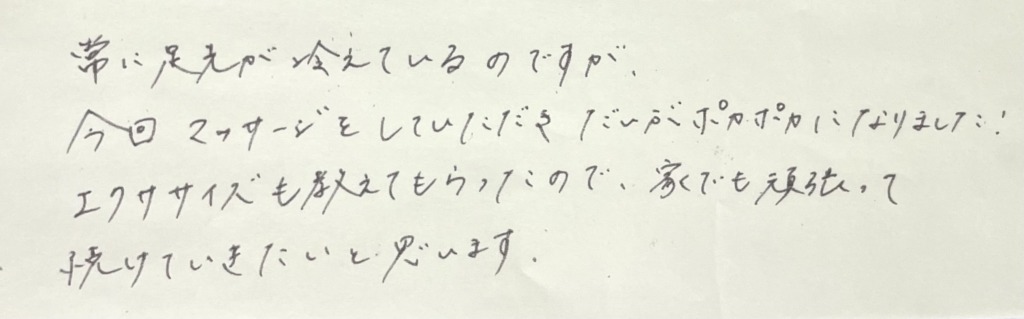 常に足先が冷えているのですが、 今回マッサージをしていただき、 だいぶポカポカになりました! エクササイズも教えてもらったので、 家でも頑張って続けていきたいと思います。