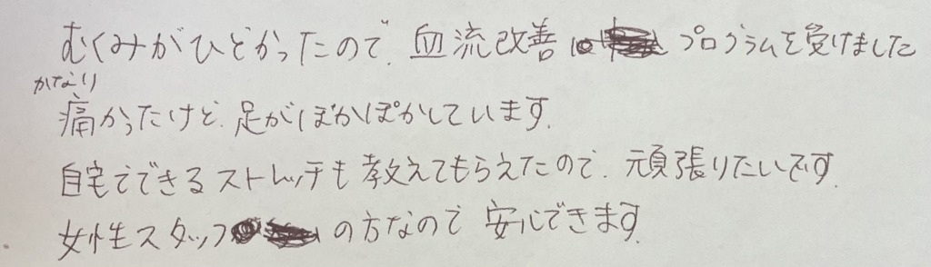 むくみがひどかったので血流改善プログラムを 受けました。 かなり痛かったけど、足がぽかぽかしています。 自宅でできるストレッチも教えてもらえたので、 頑張りたいです。 女性スタッフの方なので安心できます。
